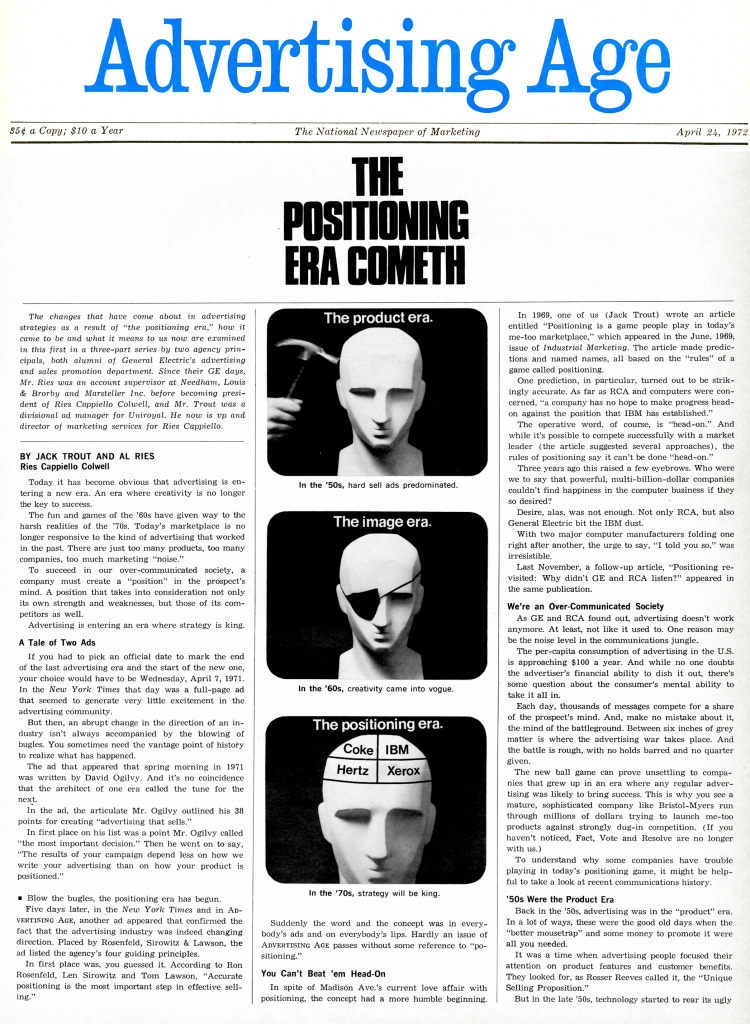 The positioning concept was created by my father Al Ries together with Jack Trout in the end of the 1960s. It became widely popular with a series of articles published in Advertising Age in 1972 titled “The Positioning Era Cometh”.